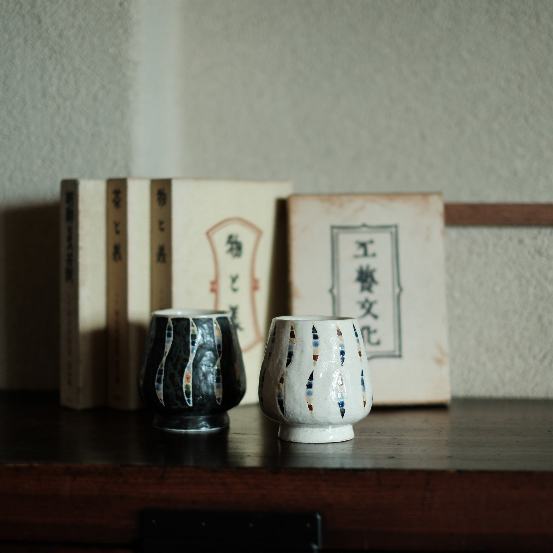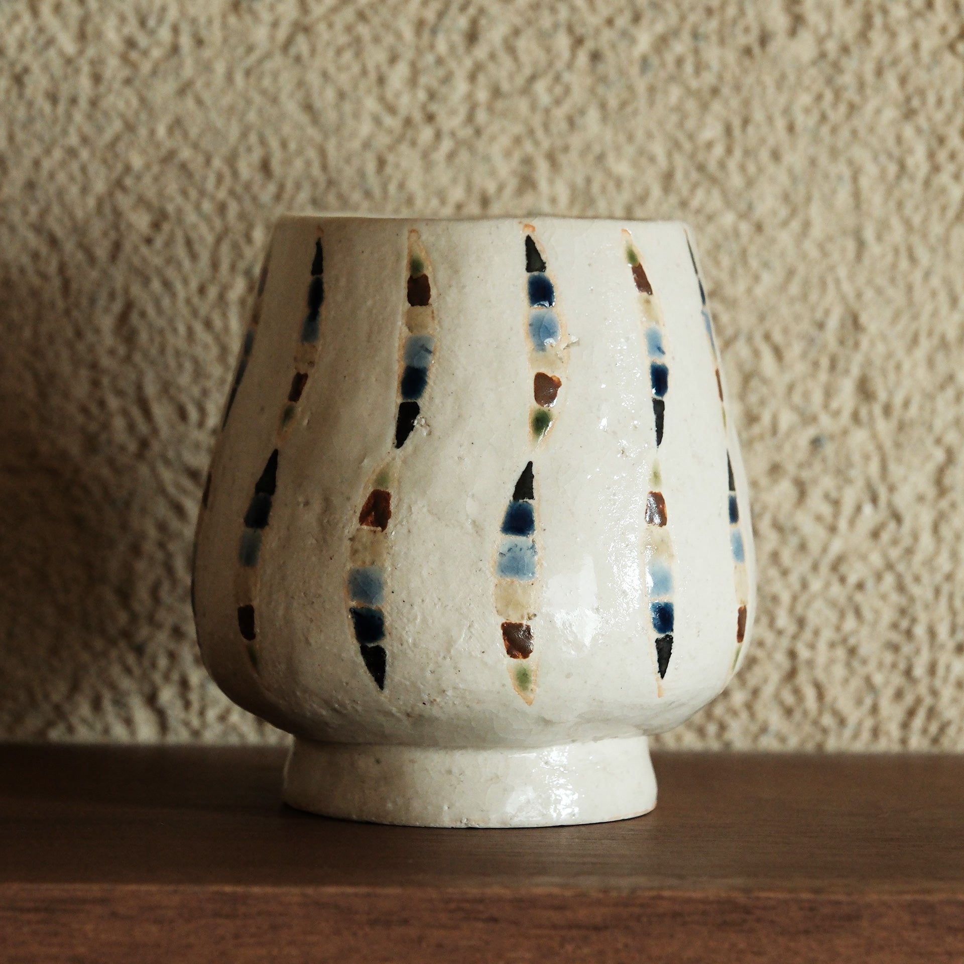 やわらかなフォルムにシャープな模様を重ね、釉薬の濃淡がひとつひとつに個性を与えます。