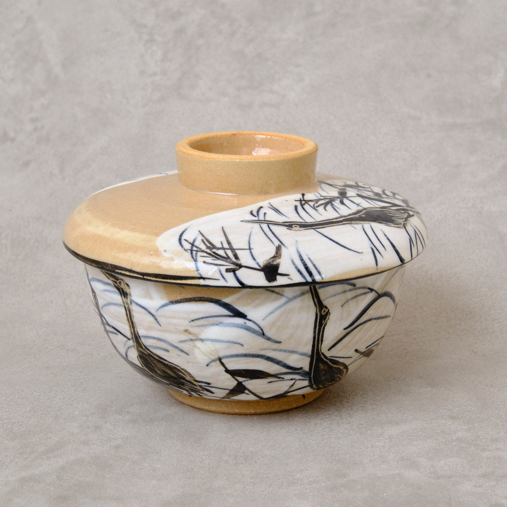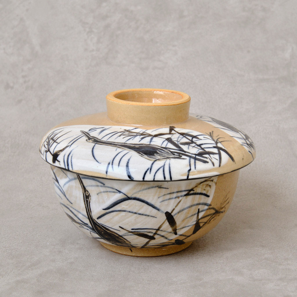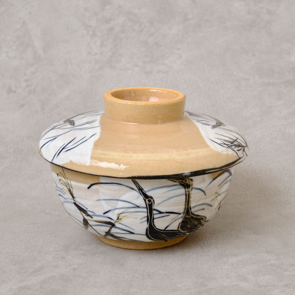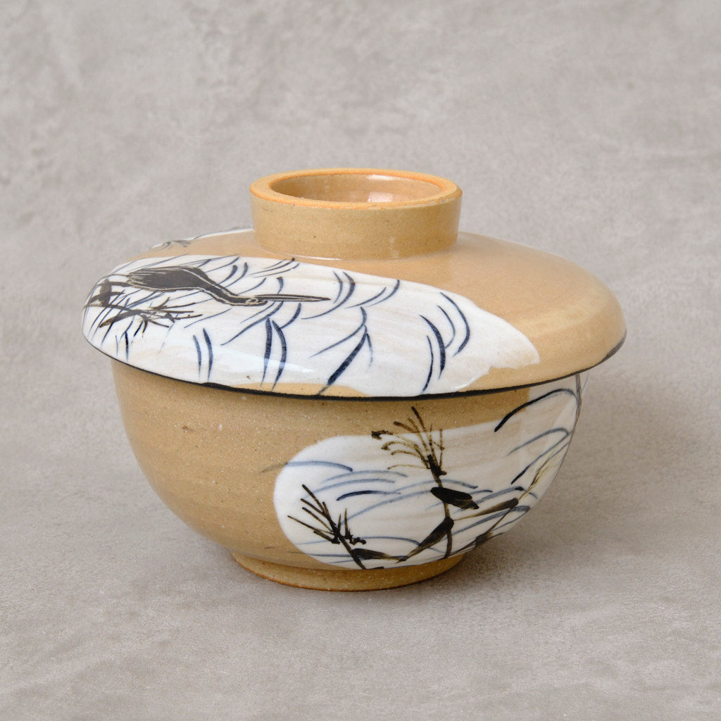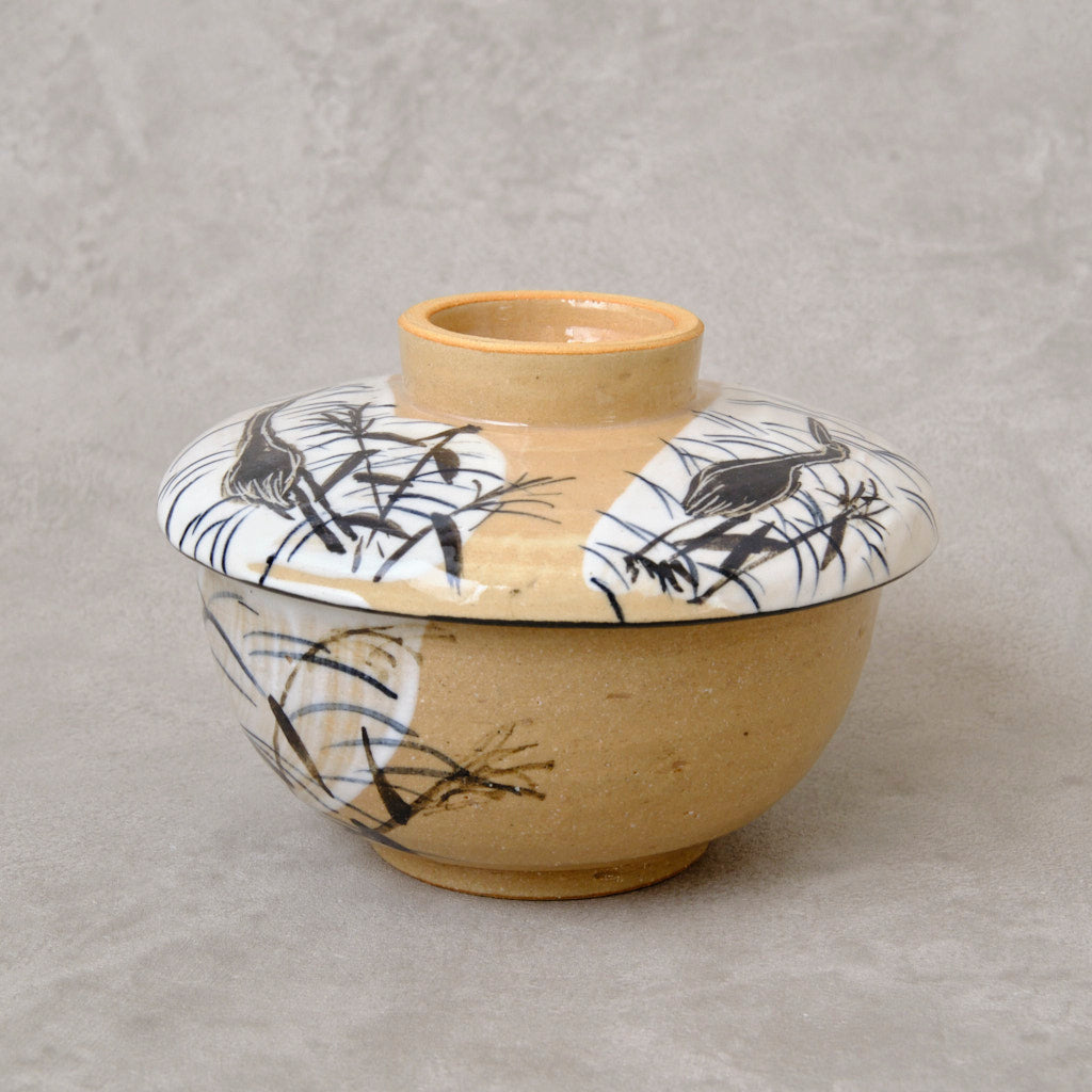 京都・清水焼の陶芸家、宮本博さんによる「葦鶴紋」の銹絵染付蓋付碗。