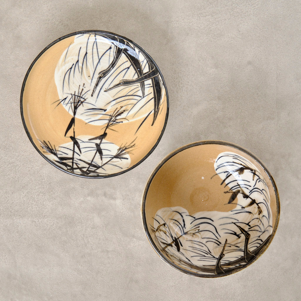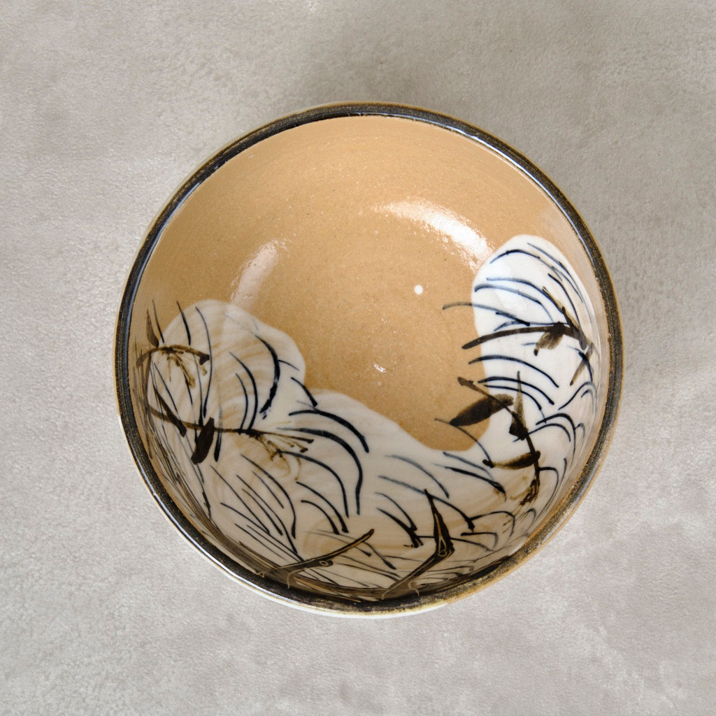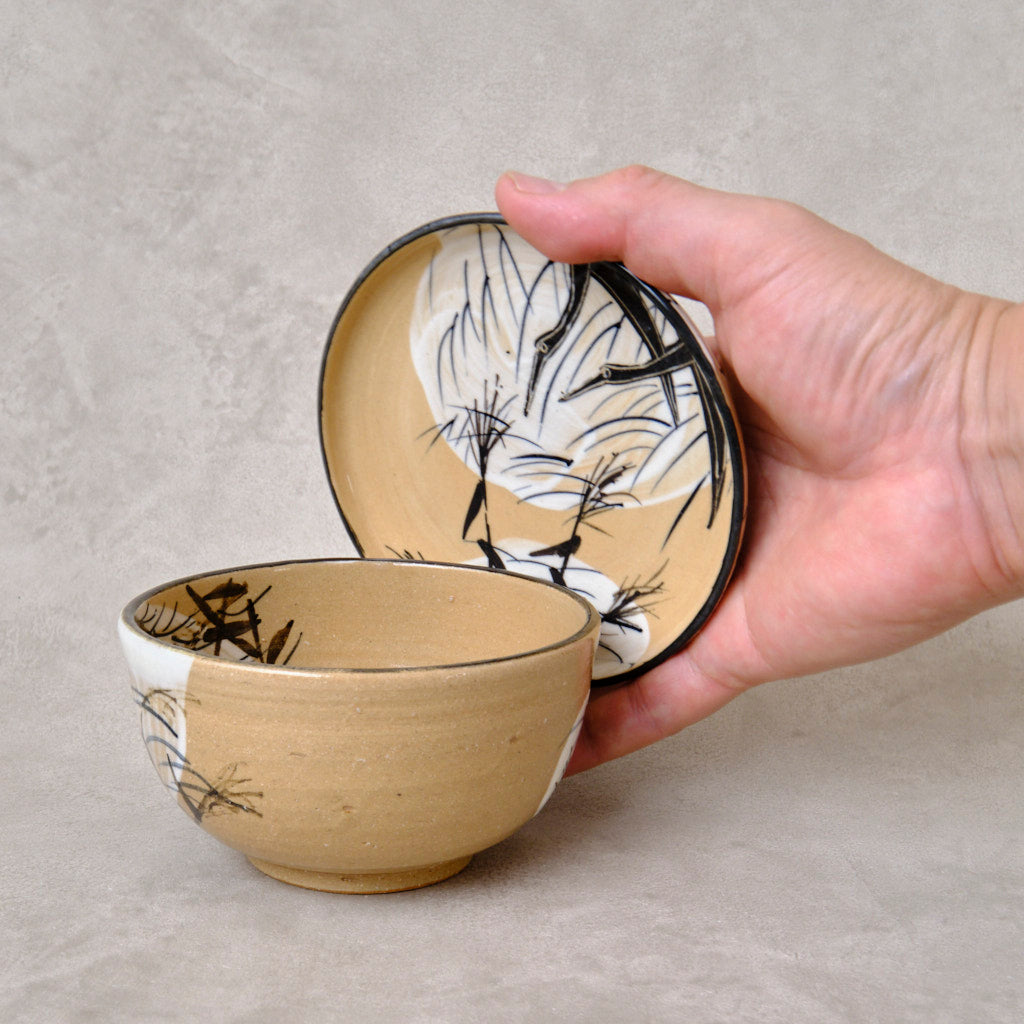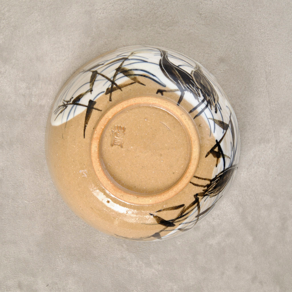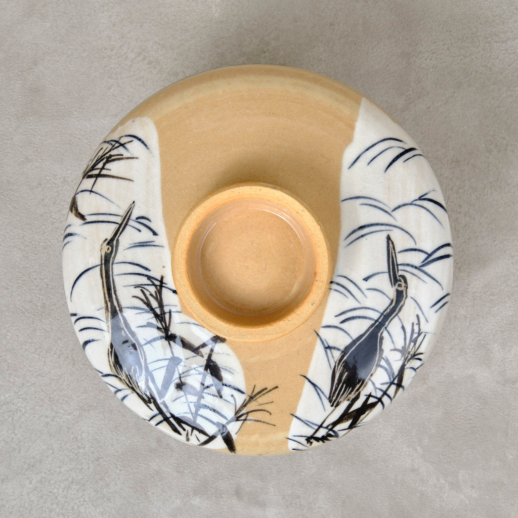 京都・清水焼の陶芸家、宮本博さんによる「葦鶴紋」の銹絵染付蓋付碗。