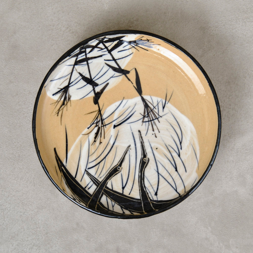 尾形乾山の意匠を写した作品で、葦の間を舞う鶴が伸びやかに描かれています。